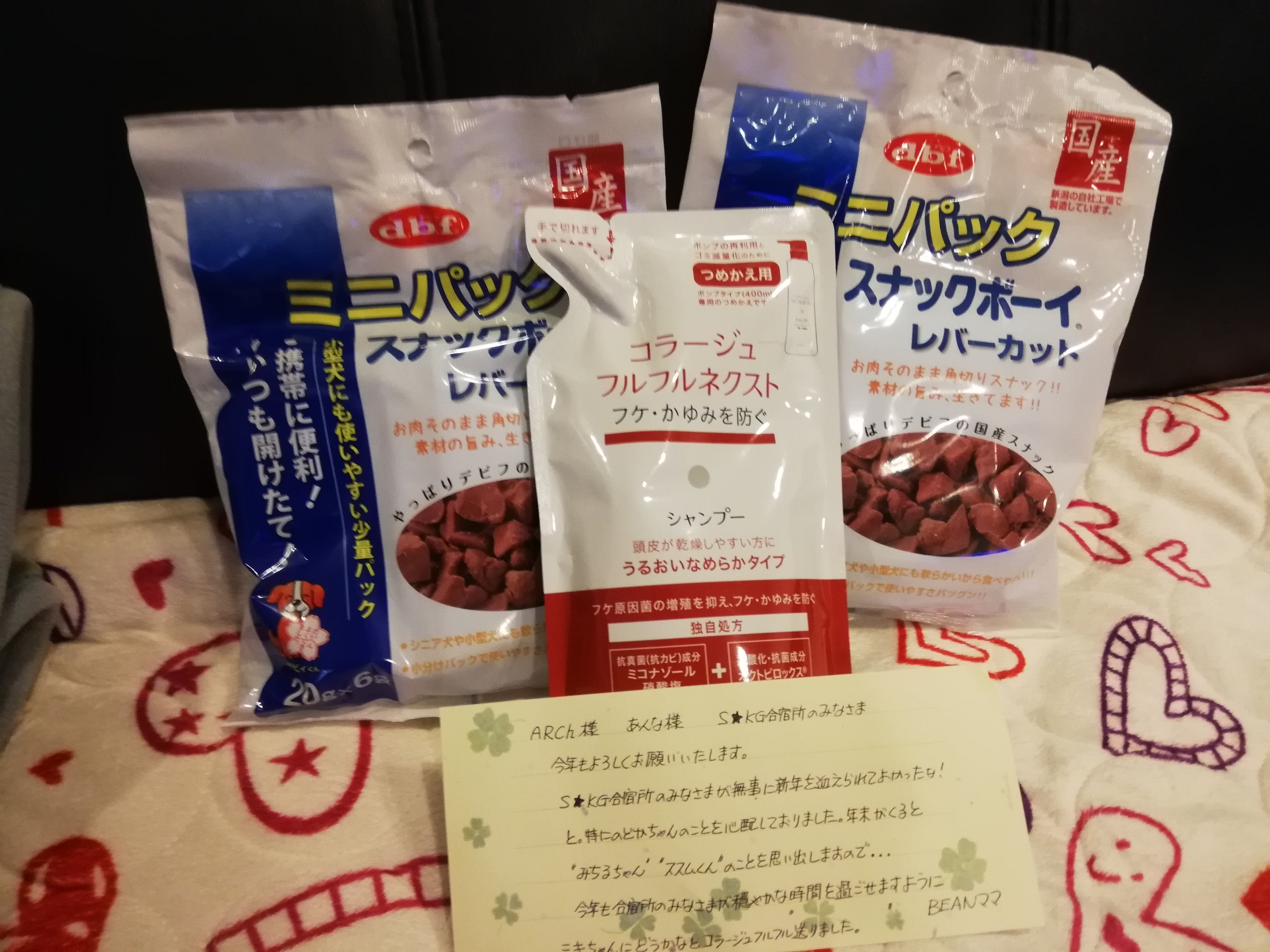 鎌倉市のBEANママ様から、S☆KG合宿所にミキちゃんの為のにコラージュフルフルシャンプーとみんなが好きなレバーのスナックを頂きました。