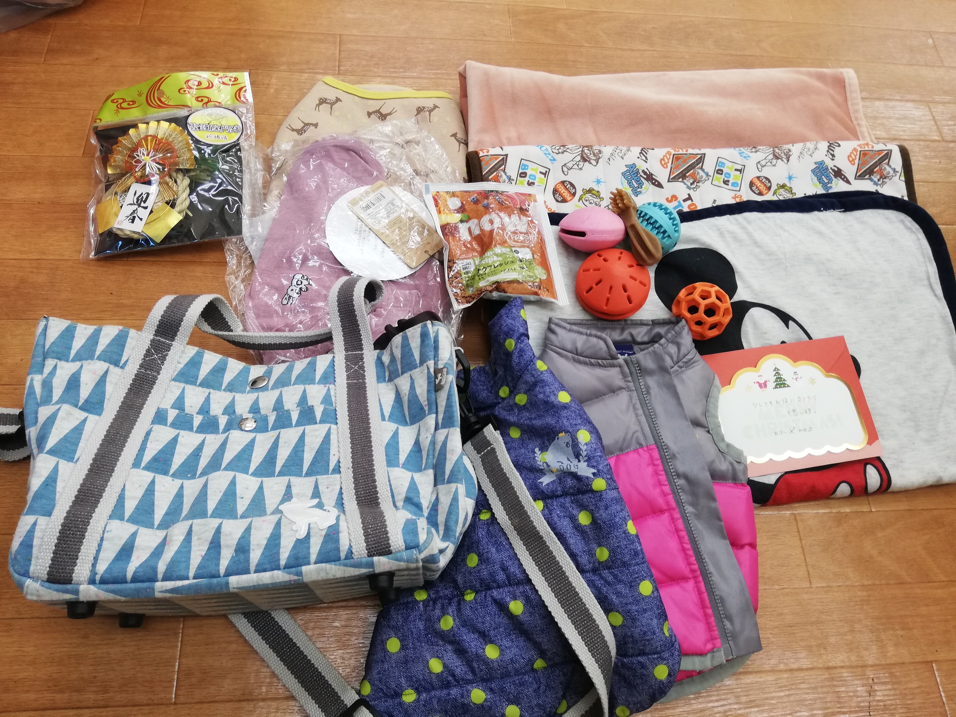 サポートファミリーでもある、中央区のくぅちゃんママ様から、小梅邸・合宿所のシニア達へのご支援とお菓子、12月里親会参加犬達へのクリスマスプレゼントを頂きました。里親会参加ワンコ達に配布させていただきました。