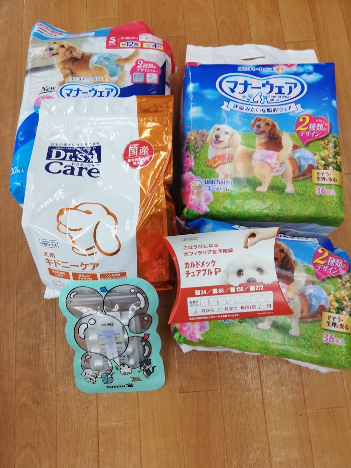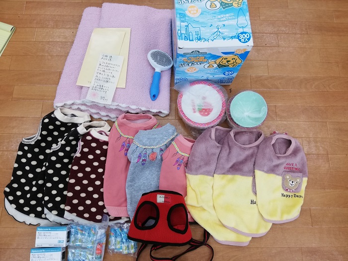 卒業ワンコのおうち、らぶすけ君ご一家様から、らぶ助君の為にご用意されていた処方食やシーツ、オムツ、お洋服などたくさんのお品を後輩達へ、と頂きました。