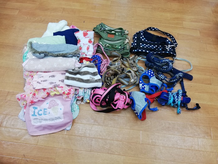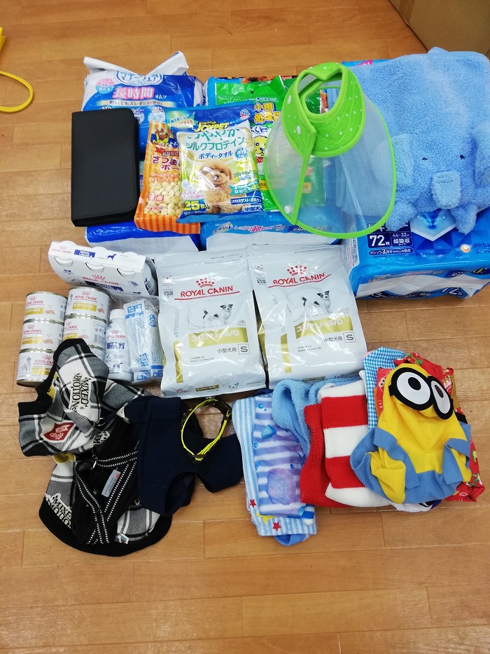 卒業生かんなちゃんのお家からかんなちゃんの為にご用意されていた商法食フードやウェットティッシュ、アンチノールやお洋服などを頂きました。