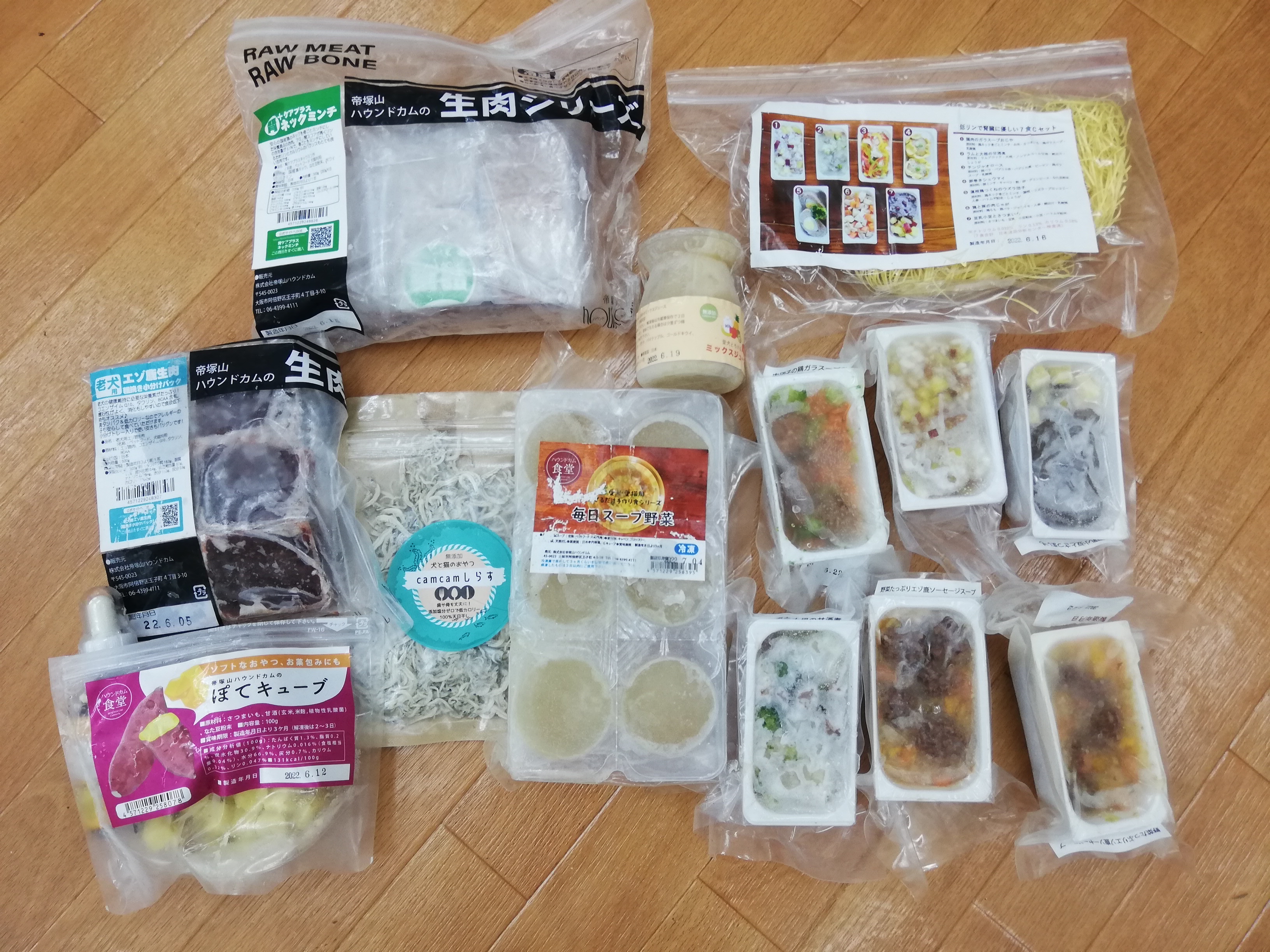 掛川市の笹本様より、ワンコ達の身体によさそうな冷凍フードや冷凍のお肉、アニモンダのウェット、おやつなどを頂きました。