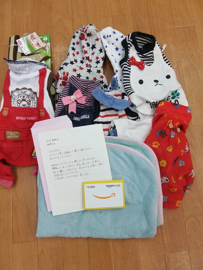 宮崎県児湯郡のヤマムラ様から、ワンコ服やひんやりマット、ARChっこ達の必要な何かの為に、のアマゾンギフト券を頂きました。