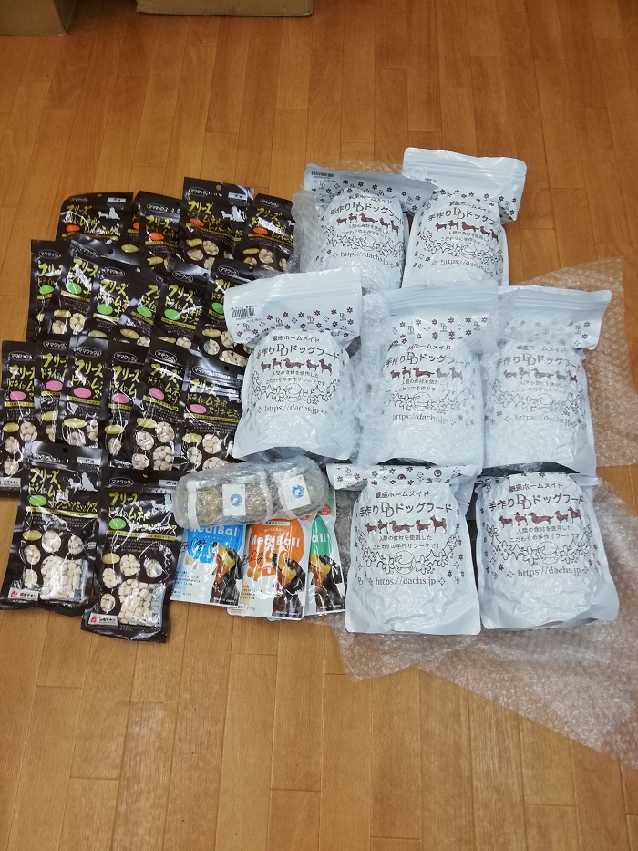 いつもMダックス達を応援・ご支援くださっている北区のキャサリン様から、ダックスさん達へのフード、おやつ、マスクを沢山頂きました。