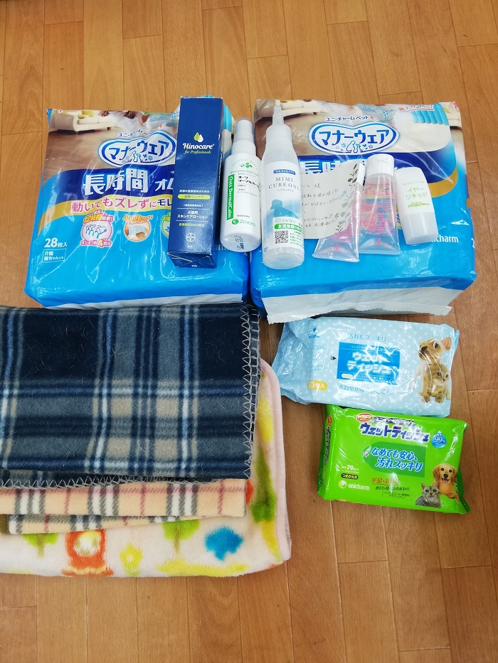 府中市の山本様より、ワンコ用オムツ、ケア用品、フリースなどを頂きました。