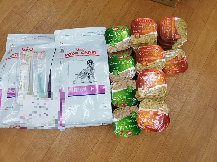 日野市からお空組になったまろ様より、保護犬達へと商法食フード、シニア用レトルトフードなどのご支援を頂きました。