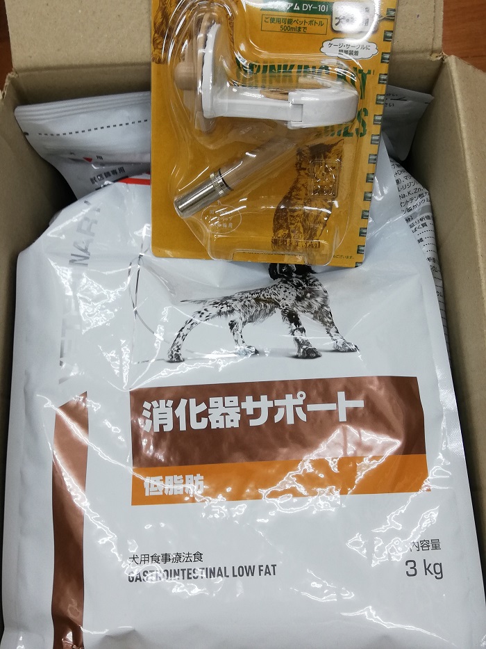 川口市のゆり様から、消化器サポート低脂肪のフードと急吸水ノズルを頂きました。